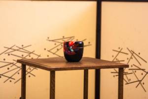 Per l’occasione abbiamo un allestimento davvero estivo: abbiamo fatto airai-jakin temae (una procedura abbastanza informale, ma molto bella in cui si porta la tazza piena d’acqua in sala da tè per dare un senso di maggiore freschezza agli ospiti) con una hirachawan (una tazza bassa e larga usata tipicamente in estate) e un natsume specifico per l’uso in Tanabata con esternamente il disegno di Orihime e internamente quello di un ramo di bambù con i tanzaku attaccati.